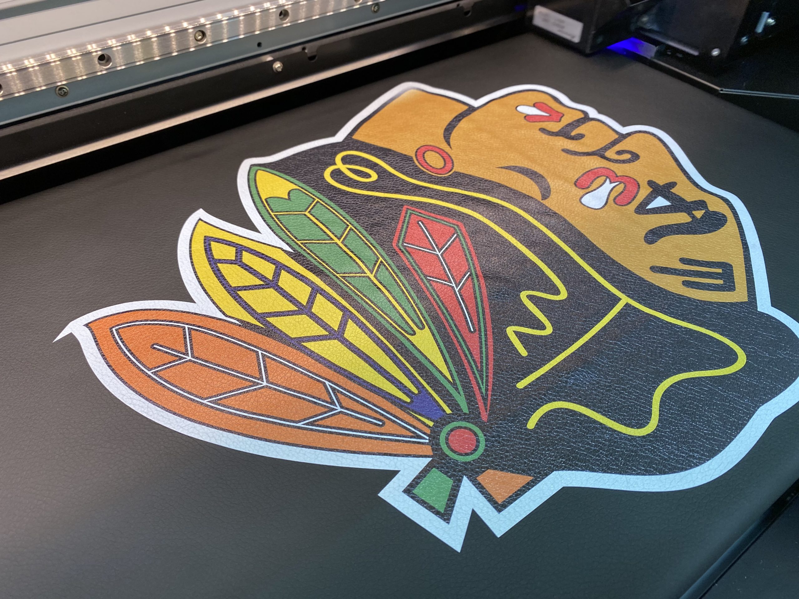 Неважно, будет ли это печать на натуральной коже или же на кожзаменителе. При этом получается полноцветная печать, так как при этом чернила взаимодействуют с покрытием. В основном подобным образом производится сувенирная продукция для различных компаний. Причём это может быть как цветная печать, так и одноцветный рисунок.